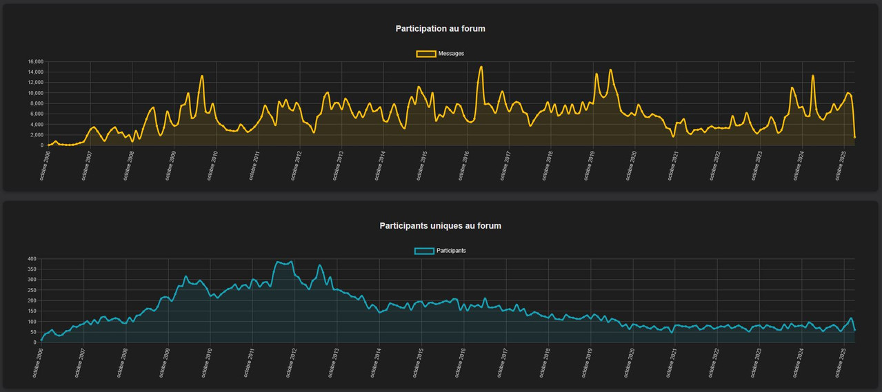 Le forum se porte bien avec presque 10.000 messages par mois, malgré le nombre de participants en baisse, il y a toujours autant de messages. Mais bon cela stagne trop en terme de participants, il faudrait revenir aux stats de 2010 à 2013 dans l'idéal.![[Image introuvable]](/img/emojis/heart_eyes.png)