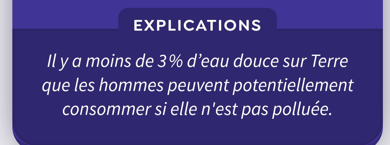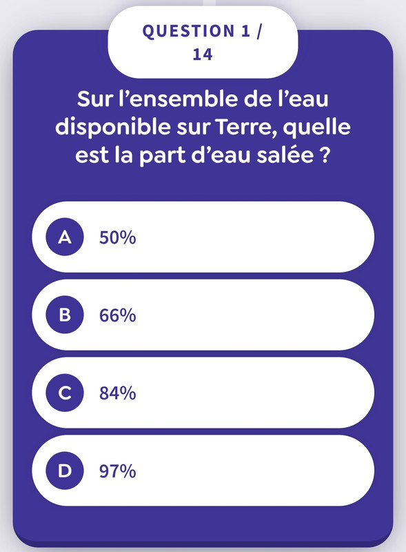 En réponse au message de Julien : Bonjour tout le monde,Attention, voici un quiz de culture générale sur l'eau (et il y a quelques pièges 😀)Question numéro 1 :